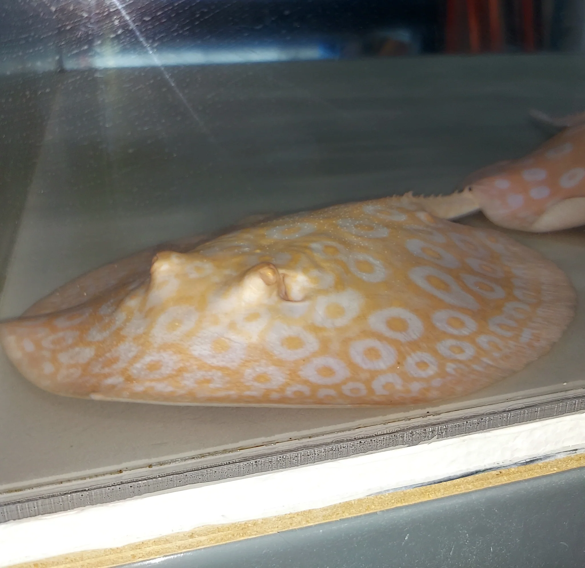 A arraia-pérola é originária do Rio Tapajós, no Brasil. Caracteriza-se por uma base marrom-dourada com anéis pretos. Nesta forma albina, as cores são invertidas, resultando em anéis brancos sobre uma base amarelo-dourada, o que não deve ser confundido com o tipo albino de base vermelha.